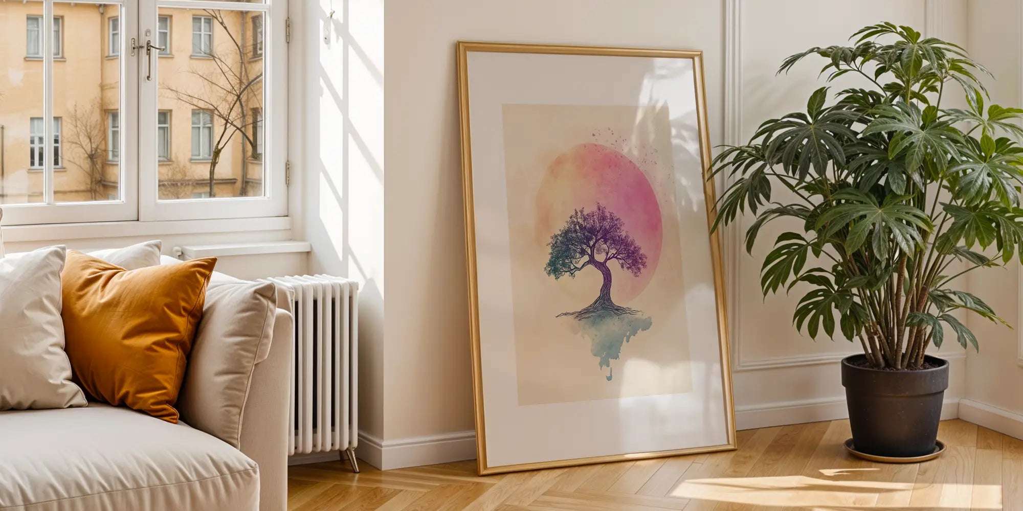 Quality matters to calm. We print on premium, archival papers so tones stay gentle and edges stay crisp. Designs are created in Switzerland and shipped worldwide, carefully packaged and ready to frame. Most pieces are available in multiple sizes to suit small sanctuaries or larger, open spaces.